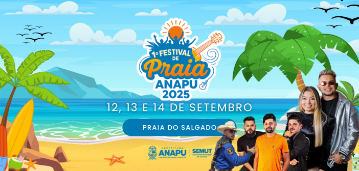 A Prefeitura Municipal de Anapu, por meio da Secretaria Municipal de Turismo (SEMUT), convida toda a população e visitantes da região para participar do 1º Festival de Praia de Anapu 2025, que acontecerá nos dias 12, 13 e 14 de setembro, na belíssima Praia do Salgado.